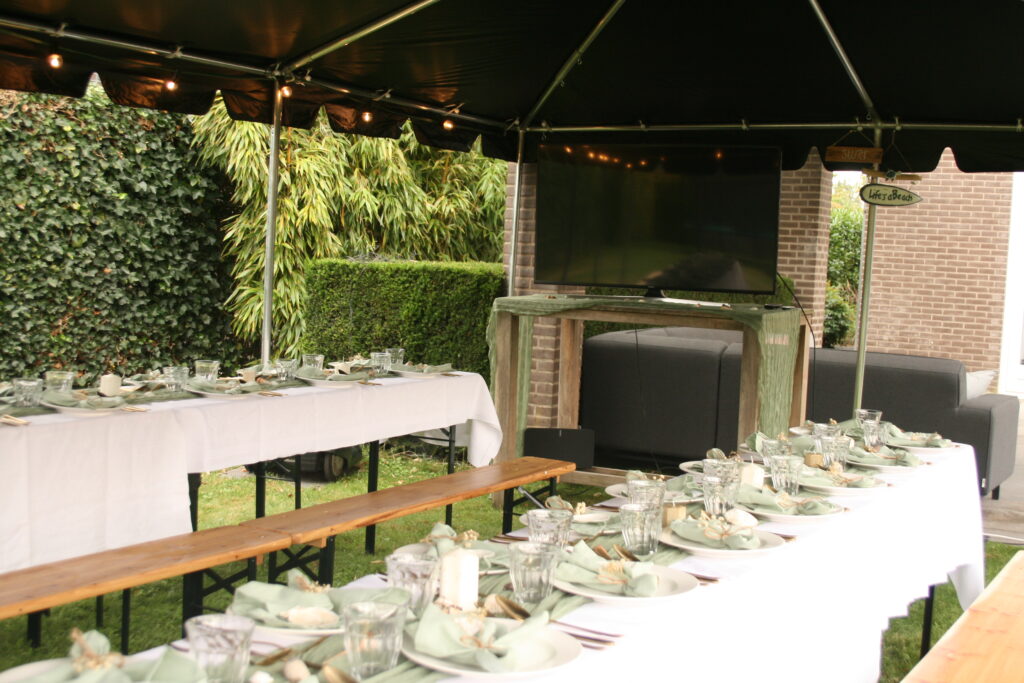 Stretchtent met gekleurde verlichting, 4 statafels met rok, 3 biertafels met banken, 2 JBL partyboxen, 2 draadloze JBL microfoons en een verrassing.