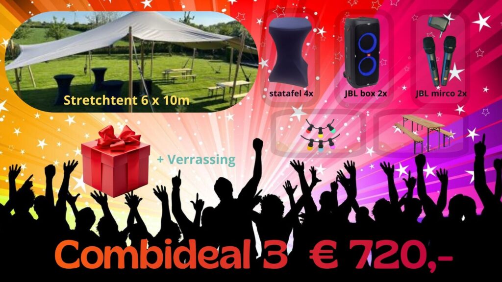 Stretchtent met gekleurde verlichting, 4 statafels met rok, 3 biertafels met banken, 2 JBL partyboxen, 2 draadloze JBL microfoons en een verrassing.